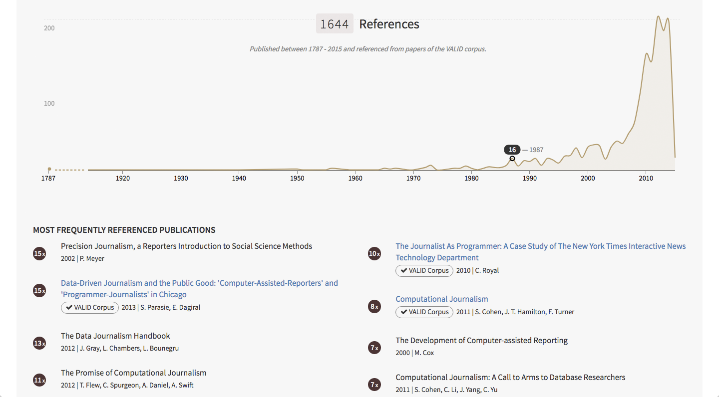 The DDJ Literature Explorer helps you to explore existing research literature on data journalism. It was developed in the course of the paper "The datafication of data journalism scholarship: Focal points, methods, and research propositions for the investigation of data-intensive newswork". Over the past years this emerging journalistic practice has been established and has also attracted significant attention from journalism scholars. It was time to take a closer look at the existing research literature in order to find out more about how this literature has been developing. Where are the research gaps and what does the future of data journalism research hold? These questions were tackled by carefully selecting a corpus of scholarly literature with empirical foundation in data journalism. This corpus was analyzed with a mixed method approach using qualitative and quantitative techniques. In this way the development of the literature over time could be illustrated and the most influential publications could be identified. Also, often-used theoretical frameworks and the applied research designs hinted at certain tendencies and gaps in the research literature on data journalism, for example, the dominance of qualitative research design over quantitative ones. Also a shortcoming of cross-national investigations and ethnographic studies was visible.