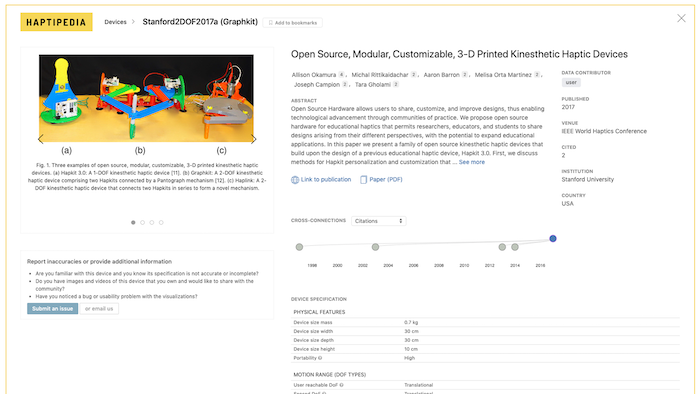 Haptipedia is an online, open-source, visualization of a growing database of 105+ haptic devices invented since 1992. Device and experience designers, with backgrounds in haptics or in other design fields, can browse and search the database to track haptic technology evolution and ideate new devices, find devices that fit their project criteria and interests, and access information and resources for obtaining and/or fabricating them. They can contribute to the database by providing or verifying data on existing or new devices.