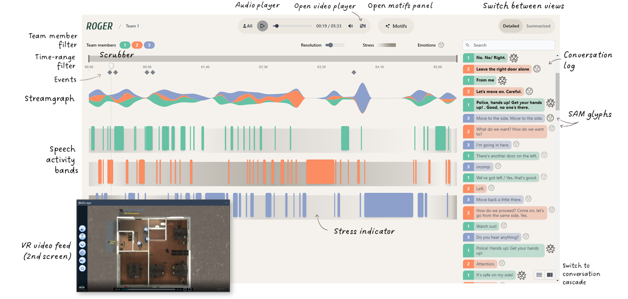 ROGER, a novel visual analytics interface designed to support afteraction reviews of communication during high-stress training scenarios. Developed in collaboration with police trainers through an